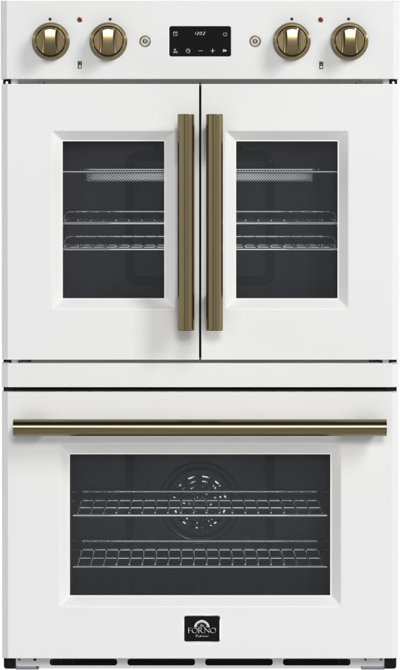 The Forno Asti 30” Double Wall Oven in white with anitque brass accessories combines elegance and performance with a French-door top oven for effortless, one-handed access. Featuring 7.36 cu. ft. of true convection cooking, it ensures even heat distribution for perfect baking results.Read More