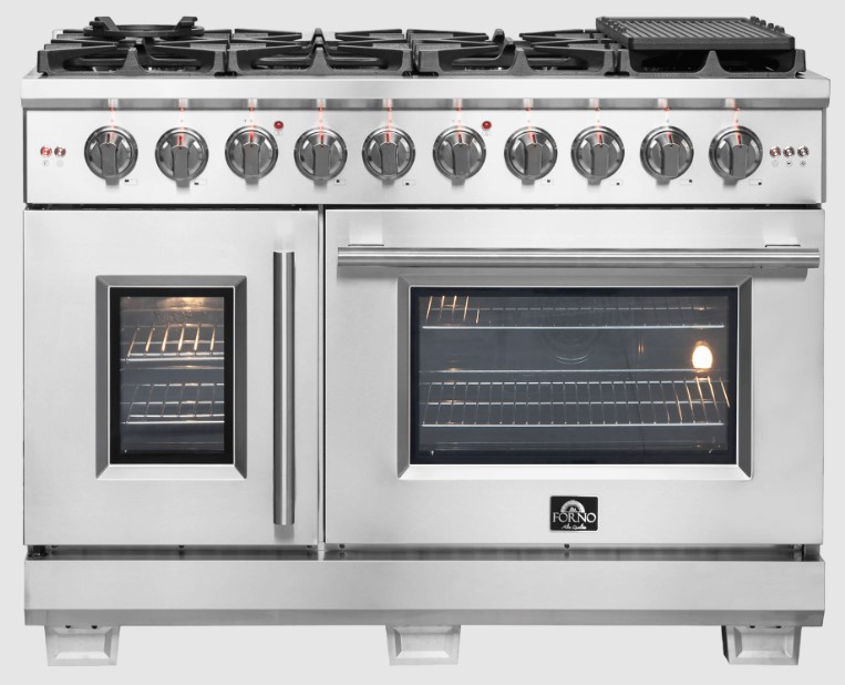 The 48” Forno Capriasca French Door Gas Range brings professional styling and Performance into your home kitchen with its durable stainless-steel design. The gas rangetop has 8 sealed dual-ring brass burners with a total output of 160,000 BTU for simmering melting chocolate or sauces, The heavy-duty continuous cast iron grates allow maximum stability of cookware mobility over a recessed enamel Cooking Surface cavity which keeps spills and splashes contained and easy to clean. Double gas ovens have a combined 6.58 cu.ft. capacity with a total output of 44,000 BTU. encased in a speckled blue enamel interiors and tempered 3-layer glass oven door windows. Right-side oven consists of a convection fan function. Included is an LP conversion kit, 6 stainless steel telescopic oven racks, wok-ring, reversible grill/griddle, rotisserie kit and skewers forks, air fry basket with rack and drip pan. Additionally, zinc coated metal knobs with bezel rings will maintain their beauty for years.Read More