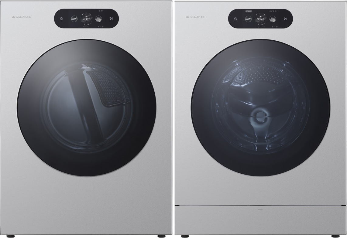 LG Signature Brushed Platinum Steel Front Load Laundry Pair with 5.8 Cu.Ft front load washer and 9 Cu.Ft smart front load electric dryer.Read More